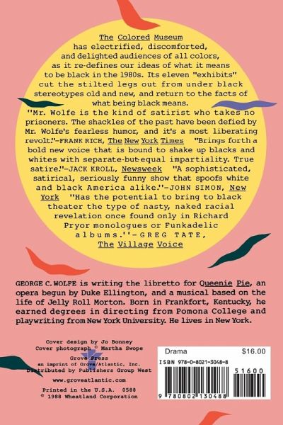 The Colored Museum has electrified, discomforted, and delighted audiences of all colors, redefining our ideas of what it means to be black in contemporary America. Its eleven "exhibits" undermine black stereotypes old and new, and return to the facts of what being black means. " Mr. Wolfe is the kind of satirist who takes no prisoners. The shackles of the past have been defied by Mr. Wolfe's fearless humor, and it's a most liberating revolt!" - Frank Rich, The New York Times; "Brings forth a bold new voice that is bound to shake up blacks and whites with separate-but-equal impartiality. True satire." - Jack Kroll, Newsweek.
