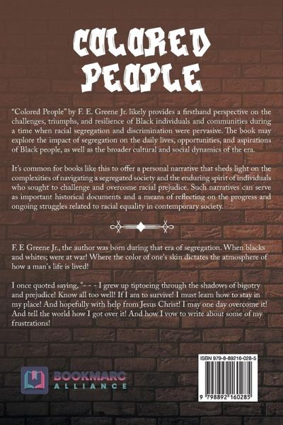 "Colored People" by F. E. Greene Jr. likely provides a firsthand perspective on the challenges, triumphs, and resilience of Black individuals and communities during a time when racial segregation and discrimination were pervasive. The book may explore the impact of segregation on the daily lives, opportunities, and aspirations of Black people, as well as the broader cultural and social dynamics of the era. It's common for books like this to offer a personal narrative that sheds light on the complexities of navigating a segregated society and the enduring spirit of individuals who sought to challenge and overcome racial prejudice. Such narratives can serve as important historical documents and a means of reflecting on the progress and ongoing struggles related to racial equality in contemporary society.