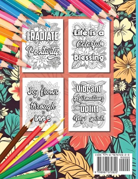 "Colorful Affirmations: Embrace Positivity," is an engaging coloring book filled with 50 beautifully designed pages that are likely to encourage happiness in individuals of all ages. Discover a world of in which you apply brilliant colors to inspirational affirmations as you begin on a creative adventure of self-expression and positive thinking. Each page is deliberately made to provide joy and inspiration to your coloring experience, delivering a lovely respite from the usual hustle and bustle. From colorful patterns to elaborate designs, these coloring pages offer a wonderful canvas for you to release your creativity and let your imagination soar. As you color in each image with your preferred hues, immerse yourself in the power of positive affirmations that accompany every page. Embracing the spirit of positivity, this coloring book is designed to raise your mood, enhance your confidence, and create a sense of optimism within you. Each affirmation is carefully chosen to instill a sense of empowerment, urging you to accept your unique talents, appreciate your achievements, and foster a positive mindset. Suitable for all ages, "Colorful Affirmations: Embrace Positivity" provides an opportunity for people of every generation to discover the therapeutic advantages of coloring while embracing the transformative power of affirmations. Whether you are seeking a tranquil moment of relaxation or a pleasant pastime to share with loved ones, this book is the appropriate companion. The big scale of 8 1/2 x 11 inches guarantees adequate space for creativity, allowing you to fully immerse yourself in the coloring process. Unleash your inner artist, bring these captivating drawings to life, and feel the profound sense of fulfillment that comes with creating something beautiful. Indulge in the therapeutic enchantment of coloring while embracing the elevating power of positive affirmations. "Colorful Affirmations: Embrace Positivity" is not simply a coloring book-it's a path towards a brighter, happier, and more fulfilling existence. Grab your colored pencils, let your imagination flow, and start on a trip of self-discovery and positivism.