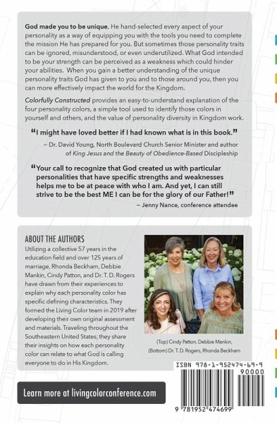 God made you to be unique. He hand-selected every aspect of your personality as a way of equipping you with the tools you need to complete the mission He has prepared for you. But sometimes those personality traits can be ignored, misunderstood, or even underutilized. What God intended to be your strength can be perceived as a weakness which could hinder your abilities. When you gain a better understanding of the unique personality traits God has given to you and to those around you, then you can more effectively impact the world for the Kingdom. Colorfully Constructed provides an easy-to-understand explanation of the four personality colors, a simple tool used to identify those colors in yourself and others, and the value of personality diversity in Kingdom work.