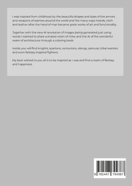 I was inspired from childhood by the beautiful shapes and sizes of the armors and weapons of warriors around the world and the many ways metals, cloth and leather after the hand of man became great works of art and functionality. Together with the new AI revolution of images being generated just using words I wanted to share a shared vision of mine and the AI of the wonderful realm of architecture through a coloring book. Inside you will find knights, spartans, centurions, vikings, samurai, tribal warriors and even fantasy inspired fighters. My best wished to you all is to be inspired as I was and find a realm of fantasy and happiness.