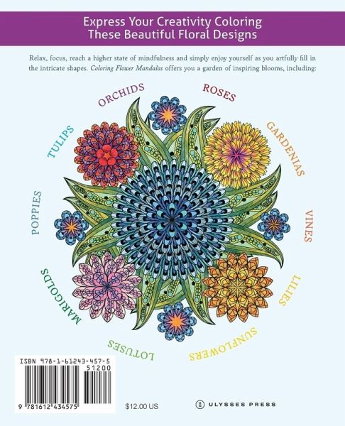 ATTAIN FOCUS, CLARITY AND PEACE WHILE ADDING BRIGHT AND INSPIRING COLORS TO THESE UNIQUE FLORAL PATTERNS Relax, focus, reach a higher state of mindfulness and simply enjoy yourself as you artfully fill in the intricate shapes. Coloring Flower Mandalas offers you a garden of inspiring blooms, including: - Orchids - Roses - Gardenias - Vines - Lilies - Sunflowers - Loutuses - Marigolds - Poppies - Tulips