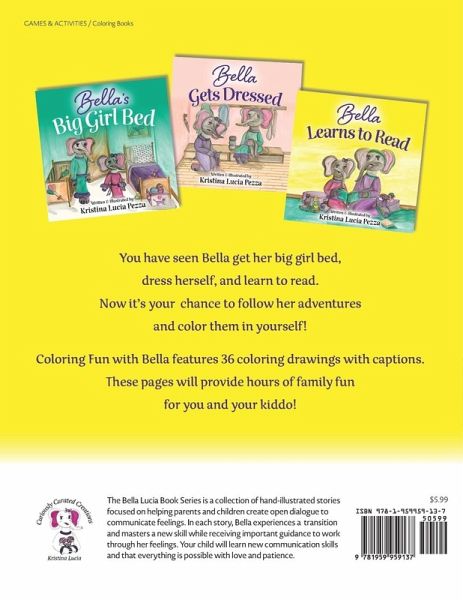 You have seen Bella get her big girl bed, dress herself, and learn to read. Now it's your chance to follow her adventures and color them in yourself! Coloring Fun with Bella features 36 coloring drawings with captions. These pages will provide hours of family fun for you and your kiddo!