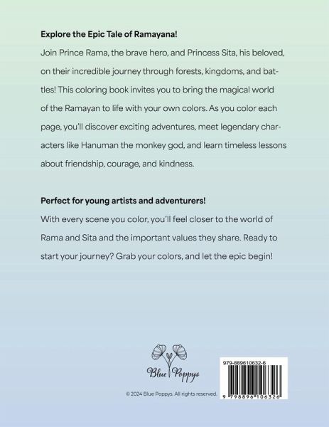 Embark on an enchanting adventure with our Ramayana Coloring Book! Designed to inspire creativity and imagination, this beautifully illustrated coloring book takes young artists on a journey through the timeless tales of the Ramayana, one of India's greatest epics. Inside this captivating book, children will discover: Vibrant Illustrations: Each page features intricate line art depicting iconic scenes and characters, including Lord Rama, Sita, Hanuman, and the mighty battles against Ravana. The simple and engaging designs are perfect for little hands to color. Educational Insights: Alongside each illustration, kids will learn about the rich stories of the Ramayana, fostering an understanding of courage, loyalty, and righteousness. Encouragement for Creativity: With blank spaces for imaginative doodles and designs, children are encouraged to express their creativity while exploring the world of ancient mythology. Hours of Fun: This coloring book provides endless entertainment for children, making it ideal for rainy days, family gatherings, or quiet time. Perfect for children aged 4 and up, this Ramayana Coloring Book is not only a fun activity but also a wonderful way to introduce young minds to the cultural heritage of India. Grab your favorite coloring tools and get ready to bring the epic tales of the Ramayana to life! Order your copy today and watch your child's creativity flourish!