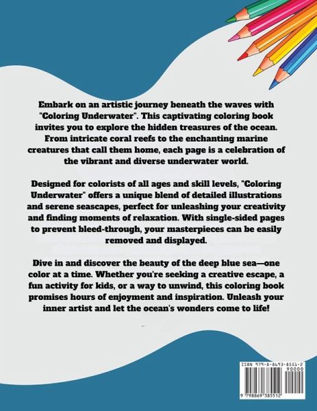 Dive into a vibrant underwater world with "Coloring Underwater," a delightful coloring book perfect for both children and adults. Explore the enchanting beauty of the ocean with intricate illustrations of coral reefs, exotic fish, and other mesmerizing marine life. Each page is designed to spark creativity and provide a relaxing coloring experience. Whether you're an experienced colorist or just beginning, this coloring book offers a wonderful escape into a magical underwater realm.Key Features:High-Quality Illustrations: Detailed and captivating designs featuring a variety of underwater scenes. Suitable for All Ages: Perfect for kids, teens, and adults who love marine life and coloring. Single-Sided Pages: Prevents bleed-through and allows you to remove and display your artwork. Variety of Marine Life: Includes a diverse range of sea creatures, from vibrant corals to colorful fish. Stress Relief: Enjoy the calming effects of coloring and take a break from daily stress. Embark on an artistic journey beneath the waves with "Coloring Underwater". This captivating coloring book invites you to explore the hidden treasures of the ocean. From intricate coral reefs to the enchanting marine creatures that call them home, each page is a celebration of the vibrant and diverse underwater world. Designed for colorists of all ages and skill levels, "Coloring Underwater" offers a unique blend of detailed illustrations and serene seascapes, perfect for unleashing your creativity and finding moments of relaxation. With single-sided pages to prevent bleed-through, your masterpieces can be easily removed and displayed. Dive in and discover the beauty of the deep blue sea-one color at a time. Whether you're seeking a creative escape, a fun activity for kids, or a way to unwind, this coloring book promises hours of enjoyment and inspiration. Unleash your inner artist and let the ocean's wonders come to life!