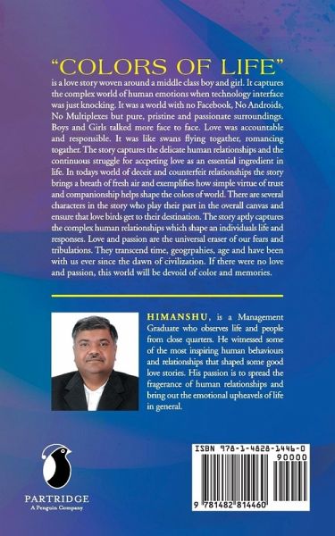 "Colors Of Life" is a love story woven around a middle class boy and girl. It captures the complex world of human emotions when technology interface was just knocking. It was a world with no Facebook, No Androids, No Multiplexes but pure, pristine and passionate surroundings. Boys and Girls talked more face to face. Love was accountable and responsible. It was like swans flying togather, romancing togather. The story captures the delicate human relationships and the continuous struggle for accpeting love as an essential ingredient in life. In todays world of deceit and counterfeit relationships the story brings a breadth of fresh air and exemplifies how simple vitue of trust and companionship helps shape the colors of world. There are several characters in the story who play their part in the overall canvas and ensure that love birds get to their destination. The story aptly captures the complex human relationships which shape an individuals life and responses. Love and passion are the universal eraser of our fears and tribulations. They transcend time, geogrpahies, age and have been with us ever since the dawn of civilization. If there were no love and passion, this world will be devoid of color and memories.