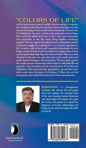 "Colors Of Life" is a love story woven around a middle class boy and girl. It captures the complex world of human emotions when technology interface was just knocking. It was a world with no Facebook, No Androids, No Multiplexes but pure, pristine and passionate surroundings. Boys and Girls talked more face to face. Love was accountable and responsible. It was like swans flying togather, romancing togather. The story captures the delicate human relationships and the continuous struggle for accpeting love as an essential ingredient in life. In todays world of deceit and counterfeit relationships the story brings a breadth of fresh air and exemplifies how simple vitue of trust and companionship helps shape the colors of world. There are several characters in the story who play their part in the overall canvas and ensure that love birds get to their destination. The story aptly captures the complex human relationships which shape an individuals life and responses. Love and passion are the universal eraser of our fears and tribulations. They transcend time, geogrpahies, age and have been with us ever since the dawn of civilization. If there were no love and passion, this world will be devoid of color and memories.