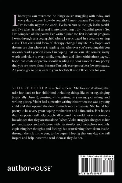 I know you can overcome the things you're struggling with today, and every day to come. How do you ask? I know because I've been there, I've seen the ugly in the world. I've been hurt by the ugly in the world, and I've taken it and turned it into something truly beautiful, poetry. So, I've compiled all the poems I've written since the first inpatient program I went through as a young child where I participated In a creative writing class. That class and form of therapy changed my life. My hopes and dreams are that whoever is reading this, wherever you're reading this you not only read it you feel it too. I'm hoping that you can take comfort in my words and relate to every simile, metaphor, and idiom within these pages. I hope that whatever precious soul is reading my book can feel in my poetry that you are never alone because I'm only ever gonna be a few steps away. All you've got to do is walk to your bookshelf and I'll be there for you.