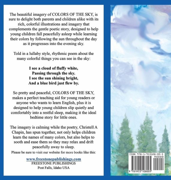 The beautiful imagery of COLORS OF THE SKY, is sure to delight both parents and children alike with its rich, colorful illustrations and imagery that complements the gentle poetic story, designed to help young children fall peacefully asleep while learning their colors by following the sun throughout the day as it progresses into the evening sky. This little prose book is also educational and makes a wonderful teaching aid for early readers or for anyone interested in learning English, in a fun and creative way. Each page is filled with rich and whimsical illustrations and imagery that will stir the imagination. The story is both calming and relaxing, sure to appeal to children all over the world. Told in a lullaby style, rhythmic poem about the many colorful things you can see in the sky. EXAMPLE: "I see a cloud of fluffy white,Passing through the sky.I see the sun shining brightAnd a blue bird just flew by." So pretty and peaceful, Colors Of The Sky, allows children to slip quietly and comfortably into a restful sleep, making it an ideal bedtime story for little ones. The imagery is calming while the poetry, Christell A Chapin, has spun together, not only helps children learn the names of many different colors, but also helps to sooth and easy them so they may relax and drift peacefully away to sleep.