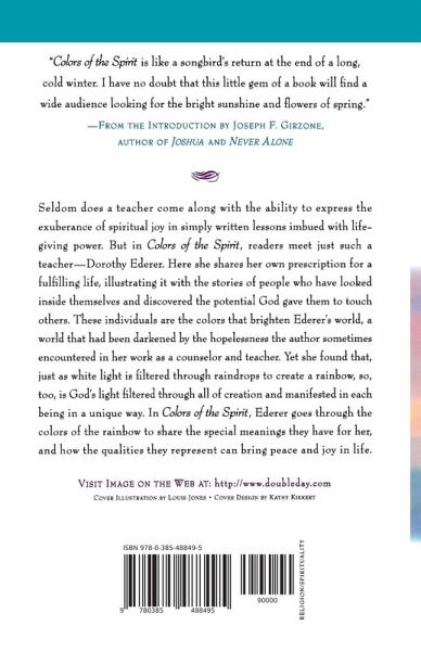 Seldom does a teacher come along with the ability to take the exuberance of spiritual joy and put it on a page in lessons of graceful simplicity and life-giving power. But in Colors of the Spirit, readers are introduced to just such a teacher in Dorothy Ederer. Here she shares her own prescription for a fulfilling life, and illustrates it with the stories of those who have enriched her own journey. You will see in these stories people who looked inside themselves and discovered the potential God gave them to touch others. These individuals were the colors that brightened Dorothy's world, a world which was sometimes darkened by the hopelessness she encountered in her work as a counselor and teacher. Yet she found that just as white light is filtered through raindrops to create a rainbow, so too is God's light filtered through all of creation and manifested in each being in a unique way. In Colors of the Spirit, Ederer goes through each color of the rainbow to share the special meanings they have for her, and how the qualities they represent can bring us peace and joy in our own lives.