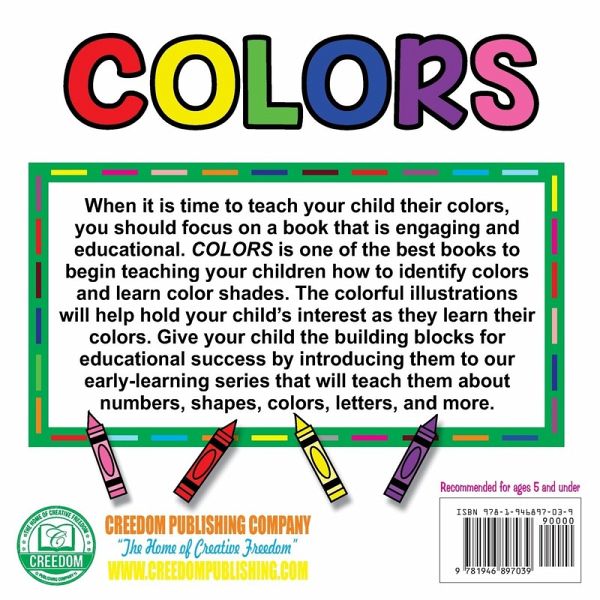Teach your preschool child how to identify different colors and encourage learning with the Colors book. This book is designed to be a toddler favorite with fun designs and bright colors. Develop your child's learning skills with the Creedom Early Learners Collection, which includes the following books: Animal Alphabet, Numbers, Shapes, Colors, Fruits, Vegetables, and more. The Creedom Early Learners Collection is specially designed to captivate a preschooler's attention while building the foundation for learning.