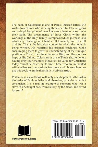 The book of Colossians is one of Paul's thirteen letters. He writes to a church who is being threatened by false religions and vain philosophies of men. He wants them to be secure in their faith. The preeminence of Jesus Christ within the workings of the Holy Trinity is emphasized. Its purpose is to refute any challenge on Christ's full humanity and His full divinity. This is the historical context in which this letter is being written. He reaffirms his original teachings, while encouraging them to grow in understanding of their unique position in Christ, their inheritance in Him, and the glorious hope of His Calling. Colossians is one of Paul's shorter letters having only four chapters. However, its value for Christians today cannot be based by its size. Those who are inundated with challenges from various teachings and philosophies can use this book to guide their faith in biblical truth. Philemon is a short book with only one chapter. It is the last in the series of Paul's epistles and, therefore, provides a perfect conclusion. It is a real-life example of someone who was a slave to sin, bought back from slavery by the blood, and saved by grace!