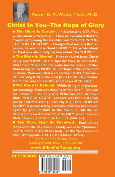 The Glory Is Certain. In Colossians 1:27, Paul wrote about a "mystery." Then he explained that the "mystery" among the Gentiles was "CHRIST IN YOU, THE HOPE OF GLORY." Though Paul was in a Roman prison, he was not without "HOPE." He wrote about it. Paul was absolutely certain about this "HOPE." The Glory Is Shared. Since the Lord Jesus Christ had given "HOPE" to the Apostle Paul, he wanted to share that "HOPE" to the Colossian believers. Rather than being led to MOPE, as, perhaps, other prisoners in Rome, Paul was filled with certain "HOPE," because of his strong faith in the Lord Jesus Christ, His Saviour. He felt he must share this good news of "GLORY." The Glory Is Defined. While living in inglorious surroundings, Paul was thinking of "GLORY." This was his "HOPE." The only One Who was able to make that "HOPE OF GLORY" possible was the Lord Jesus Christ, "OUR HOPE" (1 Timothy 1:1). This "HOPE OF GLORY" is possessed by everyone who has been born-again by genuine faith in the Saviour. All the re- deemed ones will receive this "GLORY" when they see their Saviour, and be "like Him" (1 John 3:2). The Glory Shall Be Received. Paul looked forward to the day when his body would be "fashioned like" Christ’s "GLORIOUS body" at the "first resurrec- tion" (Philippians 3:20-21; Revelation 20:5-6). The Glory Is Certain. In Colossians 1:27, Paul wrote about a "mystery." Then he explained that the "mystery" among the Gentiles was "CHRIST IN YOU, THE HOPE OF GLORY." Though Paul was in a Roman prison, he was not without "HOPE." He wrote about it. Paul was absolutely certain about this "HOPE." The Glory Is Shared. Since the Lord Jesus Christ had given "HOPE" to the Apostle Paul, he wanted to share that "HOPE" to the Colossian believers. Rather than being led to MOPE, as, perhaps, other prisoners in Rome, Paul was filled with certain "HOPE," because of his strong faith in the Lord Jesus Christ, His Saviour. He felt he must share this good news of "GLORY." The Glory Is Defined. While living in inglorious surroundings, Paul was thinking of "GLORY." This was his "HOPE." The only One Who was able to make that "HOPE OF GLORY" possible was the Lord Jesus Christ, "OUR HOPE" (1 Timothy 1:1). This "HOPE OF GLORY" is possessed by everyone who has been born-again by genuine faith in the Saviour. All the re- deemed ones will receive this "GLORY" when they see their Saviour, and be "like Him" (1 John 3:2). The Glory Shall Be Received. Paul looked forward to the day when his body would be "fashioned like" Christ’s "GLORIOUS body" at the "first resurrec- tion" (Philippians 3:20-21; Revelation 20:5-6).