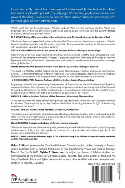 Have we really heard the message of Colossians? Is this New Testament book just another religious text whose pretext is an ideological grab for dominating power? Reading Colossians in context, ancient and contemporary, can perhaps give us new ears to hear. In this innovative and refreshing book Brian J. Walsh and Sylvia C. Keesmaat explain our own sociocultural context to then help us get into the world of the New Testament and get a sense of the power of the gospel as it addressed those who lived in Colossae two thousand years ago. Their reading presents us with a radical challenge from the apostle Paul for today. Drawing together biblical scholarship with a passion for authentic lives that embody the gospel, this groundbreaking interpretation of Colossians provides us with tools to subvert the empire of our own context in a way that acknowledges the transforming power of Jesus Christ.