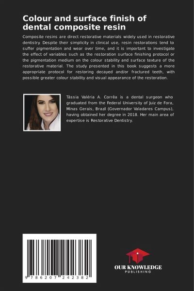 Composite resins are direct restorative materials widely used in restorative dentistry. Despite their simplicity in clinical use, resin restorations tend to suffer pigmentation and wear over time, and it is important to investigate the effect of variables such as the restoration surface finishing protocol or the pigmentation medium on the colour stability and surface texture of the restorative material. The study presented in this book suggests a more appropriate protocol for restoring decayed and/or fractured teeth, with possible greater colour stability and visual appearance of the restoration.