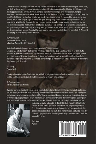 "Colour Blind tells the story of two wars affecting Australia a hundred years ago: World War I that everyone knows about, and the lesser known one, the battles that past generations of Aboriginal Australians faced. Not the British Invasion, but the struggle more than a century later when Aboriginal men who were willing to serve alongside non-Aboriginal Australians, their mates, were not seen as worthy of doing so. And the battle for ordinary citizen rights - such as joining the local RSL, of all things - went on long after the war ended. Discrimination such as this, on top of the horrors of war, could easily make this book a depressing read. But what eclipses the negativity and meanness of the way our First Australians were treated is their loyalty, their mateship and their guts, making this book a most enjoyable read from cover to cover. This book reminds us all of their marvelous contributions to Australia - lest we forget. As an Aussie who is equally grateful for my non-Aboriginal and my Aboriginal ancestry, reading of the lows as well as the highs of this nation's history gives me a better appreciation of what my Aboriginal forebears endured - and, more essentially, how they triumphed. Mr Willmott, I now eagerly await for the next book in this series." - Dr. Anthony Dillon, Postdoctoral Research Fellow, MTrainDev, Mpsych (Clin), BSc(Hons), PhD "Australian Aboriginals fighting a war for a country that didn't recognise them. Educating and entertaining are the two words I would use to describe the latesd book Colour Blind by GS Willmott. Mr Willmott has the knack to deliver interesting information about the battles of World War I as well as getting you involved in the human side of it. I enjoyed travelling on the journeys of our diggers and learning just how difficult it was for the indigenous people of Australia to not just fight but to enlist to fight for our country and get the recognition for their efforts that they so rightly deserved." - Kim Krarup, preview reader "Thank you for sending Colour Blind to me. Michael Bell our Indigenous Liaison Officer from our Military History Section read the book for me and did indicate that he is supportive of the story of Colour Blind." - Dr Brendon Nelson, Director Australian War Memorial "If you like your novels laced with a good dose of historical information and peopled with engaging characters who sound and behave like people of their time, you'll enjoy Colour Blind by Garry Willmott. Colour Blind follows several young men on their momentous journey through the Great War. There are horrors and discomforts galore, but the khaki-clad boys get by with courage, quips and a solid culture of mateship. We follow them every step of the way through the gruelling war years, and through the immediate aftermath. What makes Colour Blind unique in my reading is the inclusion of some indigenous boys who just want to do their bit like their mates. The difficulties they face are all down to red tape and the peculiar laws that deny them equal rights. Once they join up, they more than prove their mettle. So if courage and mateship and the quintessential true-blue character is your preference, read Colour Blind. If it doesn't bring a glow of equal parts indignation and pride to your heard... well you know what I mean." - Sally Odgers, author