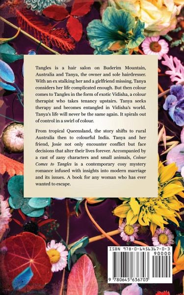 Tangles is a hair salon on Buderim Mountain, Queensland, Australia and Tanya, the owner and sole hairdresser. With an ex stalking her and a girlfriend missing, Tanya considers her life complicated enough. But then colour comes to Tangles in the form of exotic Vidisha, a colour therapist who takes tenancy upstairs. Tanya seeks therapy and becomes entangled in Vidisha's world. Tanya 's life will never be the same again.It spirals out of control in a swirl of colour.From tropical Queensland, the story shifts to rural Australia then to colourful India. Tanya and her friend, Josie not only encounter conflict but face decisions that alter their lives forever. Accompanied by a cast of zany characters and small animals, Colour comes to Tangles is a contemporary mystery romance infused with insights into modern marriage and its issues. A book for any woman who has ever wanted to escape.