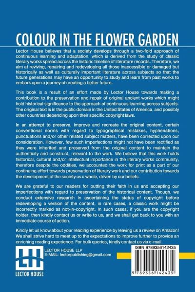 NEW PRINT WITH PROFESSIONAL TYPE-SET IN CONTRAST TO SCANNED PRINTS OFFERED BY OTHERS Colour In The Flower Garden This book is a result of an effort made by us towards making a contribution to the preservation and repair of original classic literature. In an attempt to preserve, improve and recreate the original content, we have worked towards: 1. Type-setting & Reformatting: The complete work has been re-designed via professional layout, formatting and type-setting tools to re-create the same edition with rich typography, graphics, high quality images, and table elements, giving our readers the feel of holding a 'fresh and newly' reprinted and/or revised edition, as opposed to other scanned & printed (Optical Character Recognition - OCR) reproductions. 2. Correction of imperfections: As the work was re-created from the scratch, therefore, it was vetted to rectify certain conventional norms with regard to typographical mistakes, hyphenations, punctuations, blurred images, missing content/pages, and/or other related subject matters, upon our consideration. Every attempt was made to rectify the imperfections related to omitted constructs in the original edition via other references. However, a few of such imperfections which could not be rectified due to intentional\unintentional omission of content in the original edition, were inherited and preserved from the original work to maintain the authenticity and construct, relevant to the work. We believe that this work holds historical, cultural and/or intellectual importance in the literary works community, therefore despite the oddities, we accounted the work for print as a part of our continuing effort towards preservation of literary work and our contribution towards the development of the society as a whole, driven by our beliefs. We are grateful to our readers for putting their faith in us and accepting our imperfections with regard to preservation of the historical content. HAPPY READING!