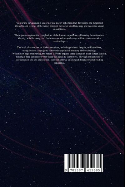 "Colour me in Cayenne & Chlorine" is a poetry collection that delves into the innermost thoughts and feelings of the writer through the use of vivid language and evocative visual descriptions. These poems explore the complexities of the human experience, addressing themes such as identity, self-discovery, and the intense emotions and vulnerabilities that come with relationships. The book also touches on darker emotions, including sadness, despair, and loneliness, using abstract language to convey the depth and intensity of these feelings. With no set page numbering, the reader is free to explore these themes in a non-linear fashion, finding a deep connection with those that speak to them most. Through this journey of introspection and self-exploration, the book offers a unique and deeply personal reading experience.