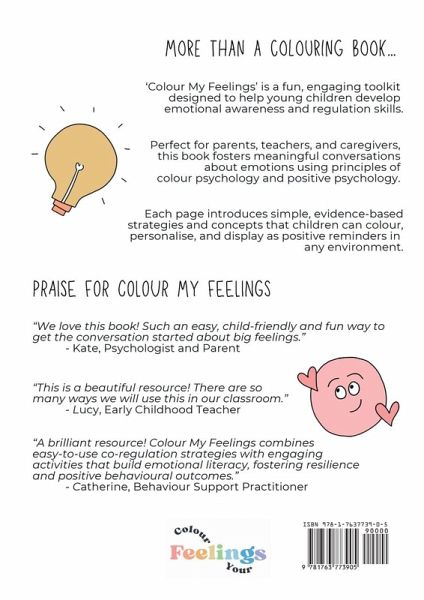 Colour My Feelings: A Creative Guide to Emotional Awareness and Regulation The Colour My Feelings colouring book is an engaging and educational tool designed to help children develop emotional awareness and regulation strategies in a fun, creative, and interactive way. Co-authored by Rebecca Ramsay, a mum of three, and Dr Daryl Marchant, a psychologist with over 30 years of experience, this book provides children with the tools to navigate their emotions confidently and resiliently. Featuring 20 thoughtfully designed pages, this book offers age-appropriate psychoeducation and calming activities for kids aged 3+. Each page combines visually appealing illustrations with simple, empowering affirmations that validate emotions and teach practical techniques for self-regulation, including grounding exercises and breathing techniques. Created for children to colour and then cut out, these pages double as beautiful posters for display in homes, classrooms, or therapy rooms. How to Use: -At Home: Parents can use this book to foster meaningful conversations about emotions while colouring together. Each page promotes emotional intelligence, mindfulness, and connection, helping children better understand their feelings. -In the Classroom: Teachers can incorporate pages into social-emotional learning activities or use them to create a calming environment for students. The focus on colour psychology and emotional awareness makes it an invaluable classroom tool. -In Therapy: Counsellors, psychologists, and behaviour support professionals can use specific pages to guide discussions about emotional expression and regulation, helping children develop healthy coping strategies. -Independent Use: Kids can enjoy colouring on their own, using the affirmations and tips to build self-awareness, emotional intelligence, and resilience. Topics Covered: -Identifying emotions and understanding their purpose -Recognising how emotions feel in the body -Techniques for self-soothing and co-regulation -Positive affirmations to boost self-esteem and resilience -Grounding exercises like breathing techniques and sensory focus -Building empathy and strengthening connections -Embracing and validating all emotions, from joy to sadness, fear, and anger