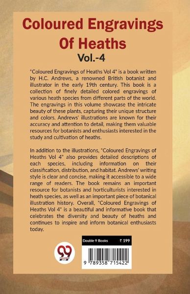 "Coloured Engravings of Heaths Vol 4" is a book written by H.C. Andrews, a renowned British botanist and illustrator in the early 19th century. This book is a collection of finely detailed colored engravings of various heath species from different parts of the world. The engravings in this volume showcase the intricate beauty of these plants, capturing their unique structure and colors. Andrews' illustrations are known for their accuracy and attention to detail, making them valuable resources for botanists and enthusiasts interested in the study and cultivation of heaths. In addition to the illustrations, "Coloured Engravings of Heaths Vol 4" also provides detailed descriptions of each species, including information on their classification, distribution, and habitat. Andrews' writing style is clear and concise, making it accessible to a wide range of readers. The book remains an important resource for botanists and horticulturists interested in heath species, as well as an important piece of botanical illustration history. Overall, "Coloured Engravings of Heaths Vol 4" is a beautiful and informative book that celebrates the diversity and beauty of heaths and continues to inspire and inform botanical enthusiasts today.