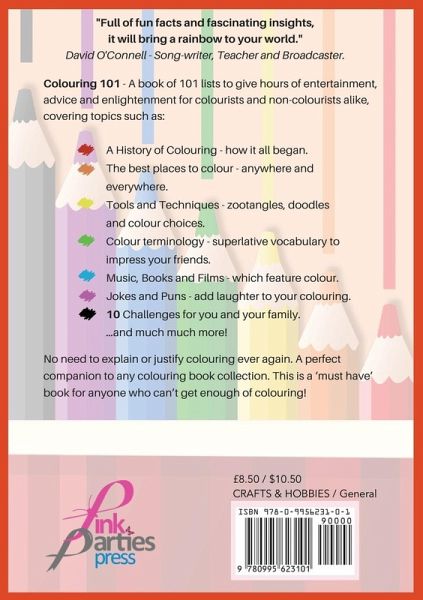 Learn everything you never knew you needed to know about colour, colouring and colouring books. Colouring 101 is written especially for colouring addicts by mother and daughter team who love to colour, and share with their fellow colourists (and non-colourists) intricate details of the world of colouring! A book filled with 101 lists to give hours of fun and guidance about colours, colouring and colouring books. It is for your entertainment, advice and encouragement and features: A History of Colouring - how it all began. The best places to colour - anywhere and everywhere. Tools and Techniques - zootangles, doodles and colour choices. Colour terminology - superlative vocabulary to impress your friends. Music, Books and Films - which feature colour. Jokes and Puns - add laughter to your colouring. 10 challenges for you and your family and much much more! The Ultimate Guide and gift for those who love colouring and colouring books. No need to explain or justify colouring every again. A perfect companion to any colouring book collection. This is a 'must have' book for anyone who can't get enough of colouring! Endorsed by David O'Connell, Song-writer Teacher and Broadcaster: "Ladey and Abbirose bring us a hugely creative book of lists. Full of fun facts and fascinating insights, it will bring a rainbow to your world. I highly recommend Colouring 101 to all convinced or would-be colouring addicts!"