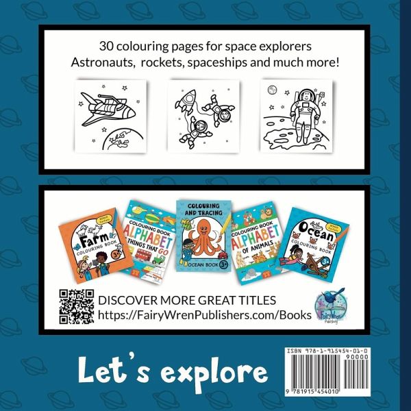 Let your child's creativity flow with this space colouring book Full of great pictures for space explorers to fill with colour. Astronauts, planets, rockets, spaceships and much more. Also includes fun facts to learn more about space! Part of a Fairywren colouring book series designed for preschool children from 3 years old. A great learning and colouring experience. · 30 Big Space Colouring Pictures, Astronauts, planets, rockets, spaceships and much more · 30 Fun Facts · Images designed for children age 3+ · Large Square Format - 22cm by 22cm · Colouring nurtures creativity, develops motor skills and encourages patience · A great gift for friends or family If you're looking for a great quality, fun colouring book about life in the stars for a child aged 3+ then this colouring book is for you!