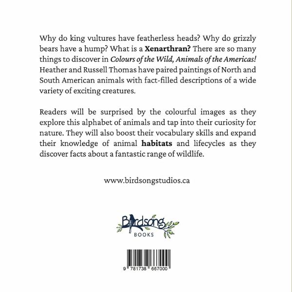 'Colours of the Wild, Animals of the Americas' pairs fascinating facts with wild colour animal portraits making this more than simply an alphabet book. Interesting for readers of all ages, both art and science lovers alike, there is a glossary for some of the longer words and a reference page to find out more. ¿Why do king vultures have featherless heads? Why do grizzly bears have a hump? What is a Xenarthran? There are so many things to discover in 'Colours of the Wild, Animals of the Americas'! Heather and Russell Thomas have paired paintings of North and South American animals with fact-filled descriptions of a wide variety of exciting creatures. Readers will be surprised by the colourful images as they explore this alphabet of animals and tap into their curiosity for nature. They will also boost their vocabulary skills and expand their knowledge of animal habitats and lifecycles as they discover facts about a fantastic range of wildlife.