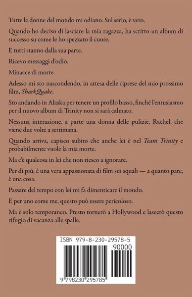 Tutte le donne del mondo mi odiano. Sul serio, è vero. Quando ho deciso di lasciare la mia ragazza, ha scritto un album di successo su come le ho spezzato il cuore. E tutti stanno dalla sua parte. Ricevo messaggi d'odio. Minacce di morte. Adesso mi sto nascondendo, in attesa delle riprese del mio prossimo film, SharkQuake. Sto andando in Alaska per tenere un profilo basso, finché l'entusiasmo per il nuovo album di Trinity non si sarà calmato. Nessuna interazione, a parte una donna delle pulizie, Rachel, che viene due volte a settimana. Quando arriva, capisco subito che anche lei è nel Team Trinity e probabilmente vuole la mia morte. Ma c'è qualcosa in lei che non riesco a ignorare. Per di più, è una vera appassionata di film sui squali - a quanto pare, è una cosa. Passare del tempo con lei mi fa dimenticare il mondo. E per uno come me, questo può essere pericoloso. Ma è solo temporaneo. Presto tornerò a Hollywood e lascerò questo rifugio di vacanza alle spalle.