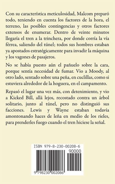 Con su característica meticulosidad, Malcom preparó todo, teniendo en cuenta los factores de la hora, el terreno, las posibles contingencias y otros factores extensos de enumerar. Dentro de veinte minutos llegaría el tren a la trinchera, por donde corría la vía férrea, saliendo del túnel; todos sus hombres estaban ya apostados estratégicamente para invadir la máquina y los vagones de pasajeros. No se había puesto aún el pañuelo sobre la cara, porque sentía necesidad de fumar. Vio a Moody, al otro lado, sentado sobre una peña, en cuclillas, como si estuviera alrededor de la hoguera, en el campamento. Repasó el lugar una vez más, con detenimiento, y vio a Kicked Bill, allá lejos, recostado contra un árbol solitario, junto al túnel, pero no distinguió sus facciones. Lewis y Wayne estaban todavía amontonando haces de leña en medio de los rieles, para prenderles fuego cuando el tren hiciese la señal.