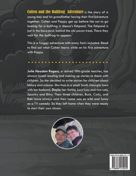 Colten and the Bullfrog Adventure is the story of a young boy and his grandfather having their first adventure together. Colten and Poppy get up before the sun to go looking for a bullfrog in Mema's fishpond. The fishpond is just in the backyard, behind the old pecan trees. There they wait for the bullfrog to appear. This is a froggy adventure with many facts included. Read to find out what Colten learns while on his first adventure with Poppy. Julie Houston Rogers, a retired fifth-grade teacher, has always loved reading and making up stories to share with children. So she decided to write stories for children about history and science. She lives in a small South Georgia town with her husband, Doyle; her Yorkie, Lucy Loo; and two cats, Spanky and Bitsy. Their three children, Buck, Cody, and Beki have always said their home was as wild and funny as a TV comedy. So they left home when they were ready to start their own sitcom.