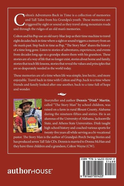 Colton's Adventures Back in Time is a collection of memories and Tall Tales from his Grandpa's youth. These memories are triggered by sight or sound as they travel along mountain roads and through the ridges of an old man's memories. Colton and his Pop use an old navy-blue Jeep as their time machine to travel eight decades back in time where a sight or sound triggers a memory from an ole man's past. Step back in time as Pop, "The Story Man" shares the history of a time long gone. Listen to stories of adventures, experiences, and events from decades long ago as a grandpa shares them with his grandson. These stories are of a way of life that no longer exist, stories about home and family, stories that teach life lessons, stories that reveal the values and principles that are so desperately needed in the world today. These memories are of a time when life was simple, less hectic, and more enjoyable. Travel back in time with Colton and Pop, back to a time where friends and family looked after one another, back to a time full of hope and wonder.