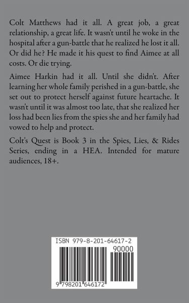 Colt Matthews had it all. A great job, a great relationship, a great life. It wasn't until he woke in the hospital after a gun-battle that he realized he lost it all. Or did he? He made it his quest to find Aimee at all costs. Or die trying. Aimee Harkin had it all. Until she didn't. After learning her whole family perished in a gun-battle, she set out to protect herself against future heartache. It wasn't until it was almost too late, that she realized her loss had been lies from the spies she and her family had vowed to help and protect. Colt's Quest is Book 3 in the Spies, Lies, & Rides Series, ending in a HEA. Intended for mature audiences, 18+.
