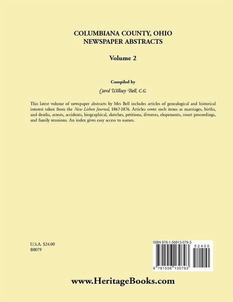 This latest volume of newspaper abstracts by Mrs Bell includes articles of genealogical and historical interest taken from the New Lisbon Journal, 1867-1876. Articles cover such items as marriages, births, and deaths, arrests, accidents, biographical, sketches, petitions, divorces, elopements, court proceedings, and family reunions. An index gives easy-access to names.