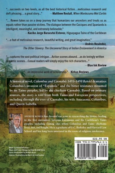 Columbus assured Spain's Queen Isabella and King Ferdinand that he'd conquer "Española" with little opposition from its inhabitants, but he soon discovered the promise ominously false. A historical novel, Columbus and Caonabó: 1493-1498 Retold dramatizes his invasion of the island on his second voyage and the bitter resistance mounted by its Taíno peoples, led by the Taíno chieftain Caonabó. Based closely on primary sources, the story is told from both Taíno and European perspectives, including through the eyes of Caonabó and Columbus. Chief Caonabó opposes any European presence on the island and massacres the garrison Columbus left behind on his first voyage. When Columbus returns, the second voyage's twelve-hundred settlers suffer from disease and famine and are alienated by his harsh rule, resulting in crown-appointed officers and others deserting for Spain. Sensing European vulnerability, Caonabó establishes a broad Taíno alliance to expel the intruders, becoming the first of four centuries of Native American chieftains known to organize war against European expansion. Columbus realizes that Caonabó's capture or elimination is key to Española's conquest, and their conflict escalates--with the fateful clash of their soldiers, cultures, and religions, enslavement of Taíno captives, the imposition of tribute, and hostile face-to-face conversations. As battles are lost, Caonabó's wife Anacaona anguishes and considers how to confront the Europeans if Caonabó is killed. The settlers grow more brutal when Columbus explores Cuba and Jamaica, and his enslaved Taíno interpreters witness them forcing villagers into servitude, committing rape, and destroying Taíno religious objects. Chief Guarionex, whose territory neighbors Caonabó's, studies Christianity with missionaries and observes the first recorded baptism of a Native in the Americas but ultimately rejects his own conversion. All brood upon the spirits' or Lord's design as epidemic diseases ravage the island's peoples. Isabella and Ferdinand are disturbed when Columbus initiates slave shipments home, but they deliberately acquiesce--and the justification for the European enslavement of Native Americans begins to evolve. The novel is the sequel to Encounters Unforeseen: 1492 Retold, which portrays the lives of the same Taíno and European protagonists from youth through 1492. There are forty-two historic or newly drawn maps and illustrations woven into the narrative, including portraits or sketches of Columbus, Caonabó, Isabella, and Anacaona. A Sources section cites authorities and discusses interpretations of historians and anthropologists contrary to the author's presentation and issues of academic disagreement.