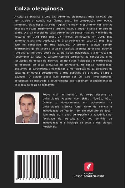 A colza de Brassica é uma das sementes oleaginosas mais valiosas que tem atraído a atenção nos últimos anos. Em comparação com outras sementes oleaginosas, a colza registou o maior crescimento nas últimas décadas e ocupa atualmente o terceiro lugar, a seguir à soja e ao óleo de palma. A área mundial de colza aumentou de pouco mais de 7 milhões de hectares em 1965 para quase 27 milhões de hectares em 2005. Este aumento revela uma duplicação da área cultivada em cada 20 anos. Este livro foi concebido em três capítulos. O primeiro capítulo contém informações gerais sobre a colza e o capítulo seguinte apresenta algumas revisões da literatura sobre as caraterísticas fisiológicas e a formação do rendimento da colza. O terceiro capítulo apresenta as conclusões e os resultados do estudo de algumas caraterísticas fisiológicas e morfológicas de espécies de colza cultivadas na primavera. Na nossa investigação, avaliámos as caraterísticas fisiológicas e morfológicas de 13 cultivares de colza de primavera pertencentes a três espécies de B.napus, B.rapa e B.juncea. O estudo deste livro parece ser útil para investigadores, estudantes de mestrado e doutoramento que trabalham especialmente na fisiologia da colza de primavera.