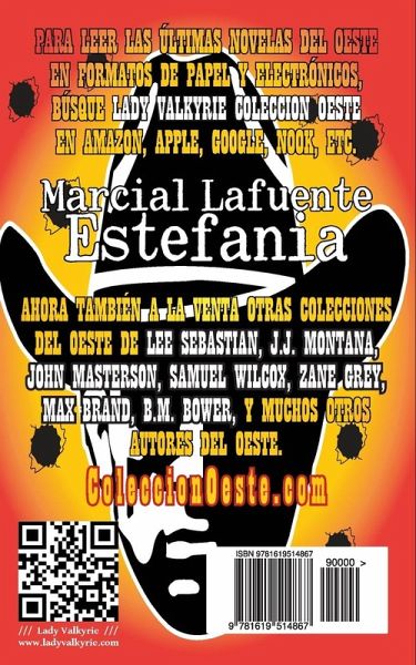 COMARCA SIN LEY Marcial Lafuente Estefanía Lady Valkyrie Colección Oeste® ColeccionOeste.com® ...Y en el viejo y legendario Oeste, hay zonas donde se siente el plomo como si fueran decoraciones en el desierto que se convierten en famosas zonas sin ley ni orden... En el salvaje oeste Americano, también conocido como "far west" o "wild west", los vaqueros (cowboys) y los pistoleros (gunman) se repartían las aventuras a partes iguales siendo héroes y villanos, dependiendo de la zona y de la situación en la que se encontraban. Los famosos relatos sobre el viejo o lejano oeste coincidieron con la exploración de los territorios vírgenes del "oeste" Americano. El estilo de vida que tuvieron en el viejo oeste estaba ligado a la explotación de las minas, la crianza de ganado, y el cultivo de la tierra. Las ciudades del viejo oeste eran unas cuantas casas de madera, una tienda para comprar los artículos variados, varias cantinas (saloons), la oficina con cárcel del sheriff, una pequeña escuela, y a veces un local de oración. Era una época de violencia, donde es habitual el uso del plomo y de la cuerda, para solucionar todo tipo de problemas. Y un lugar en el que la justicia del ojo por ojo era la salsa de cada día, y donde el Colt era el instrumento favorito para solucionar problemas. La Colección Oeste® le presenta las mejores historias del oeste en Español. Para leer las últimas novedades, visite la página internet de Amazon o nuestra página web localizada en ladyvalkyrie.com®. También están a la venta otras colecciones del oeste en Español de los grandes autores como FRANK DUGGAN, JOHN MASTERSON, LEE SEBASTIAN, J.J. MONTANA, SAMUEL WILCOX, ZANE GREY, B.M. BOWER, MARCIAL LAFUENTE ESTEFANÍA, MAX BRAND, CARLOS CLEVELAND, y de muchos otros más. Visítenos en ColeccionOeste.com® para ver todas las últimas novedades. LadyValkyrie.com®