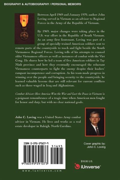 Between April 1969 and January 1970, author John Loving served in Vietnam as an advisor to Regional Forces in the Army of the Republic of Vietnam. By 1969, major changes were taking place in the U.S. war effort in the Republic of South Vietnam. As an army first lieutenant, Loving was part of a group of specially trained American soldiers sent to remote parts of the countryside to teach and fight beside the South Vietnamese Regional Forces. Loving tells of his attempts to counsel older Vietnamese officers as well as instances of combat with the Viet Cong. He shares how he led a team of five American soldiers in Tay Ninh province and how they eventually encouraged the reluctant Vietnamese counterparts to fight the enemy despite their leaders' rampant incompetence and corruption. As his team made progress in winning over the people and bringing security to the countryside, he learned valuable lessons that are still relevant for current conflicts such as those waged in Iraq and Afghanistan. Combat Advisor: How America Won the War and Lost the Peace in Vietnam is a poignant remembrance of a tragic time when American men fought for honor and duty, but with no clear national goals.