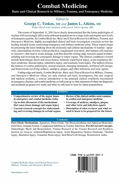 Trauma and exposure to toxic and infectious agents invariably lead to organ damage followed by significant morbidity and mortality. Although these conditions have typically been associated with the battlefield, today they are more prevalent in urban areas. The events of September 11,2001 have brought this problem to the forefront of national and international concern. The demand for solutions is justifiably high, and the research community needs to adjust its efforts appropriately. Combat Medicine is meant to be a concise manual for the young clinical or basic investigator who is studying organ injury following trauma or toxic or infectious assaults either in an urban or battlefield setting, with an emphasis on current research issues in emergency and military medicine. The aim of Combat Medicine is to inspire surgical and medical residents and fellows, as well as biology and biochemistry students and fellows, to pursue research careers in the fields of military, trauma, and emergency medicine. Combat Medicine is not intended to be an exhaustive review; rather it is an introduction to key principles of this field.