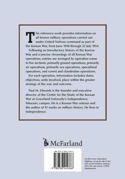 This reference work provides information on all known military operations carried out under United Nations command as part of the Korean War, from June 1950 through 22 July 1954. Following an introductory history of the Korean War and a precise chronology of all Korean War operations, entries are arranged by operation name in five sections: primarily ground operations, primarily air operations, primarily sea operations, specialized operations, and covert and clandestine operations. For each operation, information includes dates, objectives, units involved, place within the greater strategy of the war, and outcome.