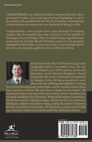 Combat Ready was written by and for veterans and active-duty personnel. It takes you on the journey from beginning to end of the military life paralleled by the life of a Christian. Personal and combat stories are interwoven into the book to bring it to life. Unfortunately, some people have gone through live-action combat. But few people know that everyone is in the middle of the largest war ever fought. There is a battle being waged between good and evil. Combat Ready will show you how to be properly equipped for this battle, to come out on top. Combat Ready shows how you are uniquely qualified to be a soldier for Christ.