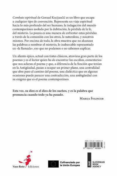 Combate espiritual de Gorazd Kocijan¿i¿ es un libro que escapa a cualquier tipo de convención. Representa un viaje espiritual hacia lo más profundo del ser humano, la indagación del mundo contemporáneo asolado por la dubitación, la pérdida de la fe, del misterio. La poesía es una manera de enfrentar estas pérdidas a través de la comunión con los otros, la naturaleza, y nosotros mismos. Por encima de todo, la obra muestra que no alcanzan las palabras a nombrar el misterio, lo inabarcable representado en la llamada, eso que no podemos o no sabemos explicar. Un aliento épico, actual con tintes clásicos, atraviesa gran parte de los poemas y es el lector quien ha de encontrar los escolios, comentarios que nos aclaran el poema y que, a diferencia de la función que tenían en la Antigüedad, pasan a ocupar un primer plano, una centralidad que abre paso al camino del poema, una dialéctica que en algunas ocasiones puede parecer una contradicción, una ambigüedad con su enigma que es el poema contemporáneo. Esta vez, su dios es el dios de los sueños, y es la palabra que pronuncia cuando todo ya ha pasado. Marija vajncer