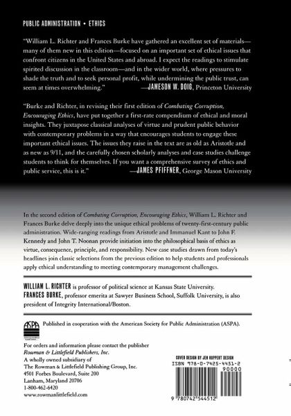In their second edition of Combating Corruption, Encouraging Ethics, William L. Richter and Frances Burke update this essential staple to delve deeply into the unique ethical problems of twenty-first century public administration. Wide-ranging readings from Aristotle and Kant to John Kennedy and John T. Noonan provide initiation into the philosophical basis of ethics as virtue, consequence, principle, and responsibility, while new case studies drawn from today's headlines join old classics from the previous edition to help students apply ethical foundations to a modern administrative career. New chapters on privacy, secrecy, and confidentiality and the changing boundaries of public administration consider the consequences of computerization and globalization, two of this century's greatest challenges. By seamlessly melding theory with practice, Richter and Burke have created a key resource in educating future public administrators on the ethical problems associated with corruption, deception, evasion of accountability, and the abuse of authority. Open-ended examples and discussion questions encourage students to understand the complexity of administrative ethics and the need for careful thought in their day-to-day decisions. Combating Corruption, Encouraging Ethics offers both the depth demanded by graduate courses in administrative ethics and the accessibility necessary for an undergraduate introduction to public administration.