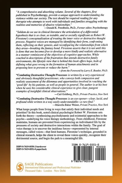What keeps people from living in ways that satisfy their individual needs and priorities? This book explores psychotherapist Robert W Firestone's voice therapy technique, the goal of which is to uncover these limiting forces, which are represented by internal messages or voices. Firestone maintains that from childhood, people are prevented from experiencing an individuated life by the pressures of society, particularly the nuclear family. He expounds the theory, which synthesizes psychodynamic and existential approaches, behind his technique. He demonstrates how the therapy helps clients reveal these voices quickly, recognize their source and begin to take a path to a meaningful life.