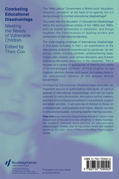 The New Labour Government puts Education, Education, Education at the heart of its agenda but is it doing enough to combat educational disadvantage? Combating Educational Disadvantage sets the discussion of educational disadvantage within the socio-political context of the 1980s and 1990s, with its market philosophy in education and brings together the contributions of leading writers and researchers of international standing.