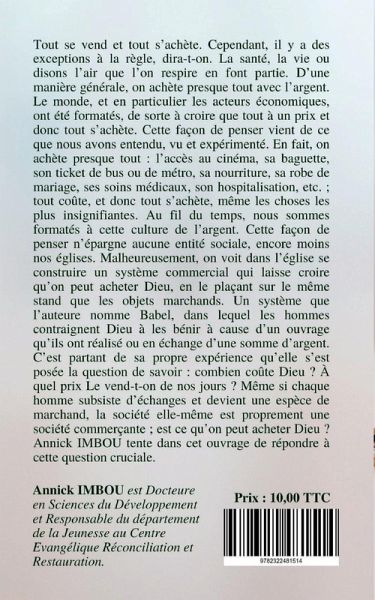 Tout se vend et tout s'achète. Cependant, il y a des exceptions à la règle, dira-t-on. La santé, le vie ou disons l'air que l'on respire en font partie. D'une manière générale, on achète presque tout avec l'argent. Le monde, et en particulier les acteurs économiques, ont été formatés, de sorte à croire que tout à un prix et donc tout s'achète. Cette façon de penser vient de ce que nous avons entendu, vu et expérimenté. En fait, on achète presque tout: l'accès au cinéma, sa baguette, son ticket de bus, de métro, ses soins médicaux, son hospitalisation, etc., tout coûte et donc tout s'achète, même les choses les plus insignifiantes. Au fil du temps mous sommes formatés à cette culture de l'argent. Malheureusement, on place Dieu sur le même stand que les objets marchands. A quel prix le vend-t-on de nos jours? Combien coûte Dieu? C'est partant de son expérience que l'auteure s'est posée cette question et tente dans cette ouvrage de nous donner la réponse.