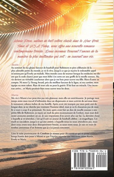 Marie Force, auteur de best-sellers classés dans le New York Times et USA Today, nous offre une nouvelle romance contemporaine torride. Deux inconnus trouvent l'amour de la manière la plus inattendue qui soit : en sauvant une vie. Austin Au sommet de ma gloire, lanceur de baseball pour Baltimore et père célibataire de la plus adorable petite du monde, je vis le rêve. Jusqu'à ce que je reçoive le redoutable appel m'annonçant qu'Everly est malade. Mon monde cesse de tourner lorsque les médecins me disent que la seule chance pour que mon bébé s'en sorte est une greffe de la moelle osseuse. Ma vie devient un véritable cauchemar alors que je me bats pour sauver ma fille. Rien d'autre ne compte. Ni mon Cy Young Award, prix du meilleur lanceur de la ligue, ni ma carrière, mon équipe ou mon talent. Rien de tout cela ne peut la guérir. Il lui faut un miracle. Une inconnue arrive... et Maria pourrait bien nous sauver tous les deux. Maria Ma vie à Miami n'est peut-être pas très glamour, mais elle est enrichissante. Je partage mon temps entre mon travail d'infirmière dans un dispensaire et mon activité de serveuse dans le restaurant cubano-italien de ma famille. Après avoir été trompée par mon petit ami de longue date, je ne cherche pas vraiment l'homme idéal, mais je ne le chasserais pas de mon lit si tout à coup il se présentait. Six mois après avoir fait un don de moelle osseuse à une petite fille de Baltimore, je reçois un mail du père reconnaissant de l'enfant, mais tout doit rester anonyme pendant un an. Je suis impatiente d'en savoir plus sur lui. La dernière chose à laquelle je m'attendais, c'est qu'il soit un joueur de baseball célèbre - et magnifique. Les mails se succèdent, jusqu'à ce qu'une amitié, à laquelle nous ne nous attendions pas, mais dont nous avons tous deux désespérément besoin, se noue entre nous. Je suis en train de tomber amoureuse d'un homme que je n'ai jamais rencontré. Lisez la suite passionnante de Combien je ressens pour découvrir ce qui se passe lorsqu'Austin doit jouer à Miami et que l'équipe organise une rencontre entre Austin, Everly et Maria.