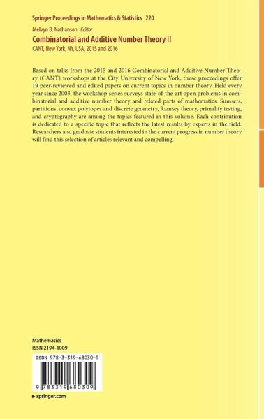 Based on talks from the 2015 and 2016 Combinatorial and Additive Number Theory (CANT) workshops at the City University of New York, these proceedings offer 19 peer-reviewed and edited papers on current topics in number theory. Held every year since 2003, the workshop series surveys state-of-the-art open problems in combinatorial and additive number theory and related parts of mathematics. Sumsets, partitions, convex polytopes and discrete geometry, Ramsey theory, primality testing, and cryptography are among the topics featured in this volume. Each contribution is dedicated to a specific topic that reflects the latest results by experts in the field. Researchers and graduate students interested in the current progress in number theory will find this selection of articles relevant and compelling.