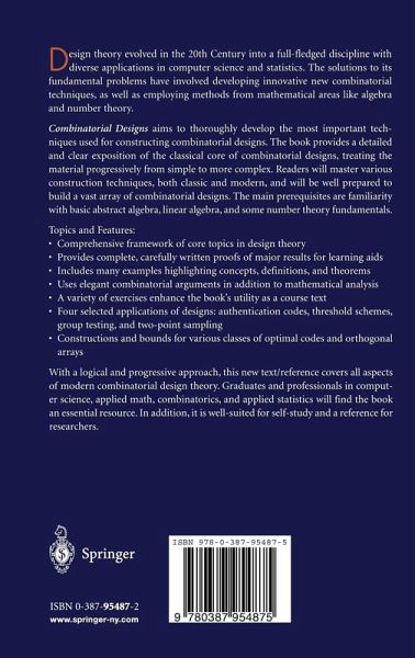 From the reviews: "This is the first rate textbook in combinatorial design theory, providing an elegant treatment ... . Topics have been chosen well ... . The language is clear and crisp. Proofs are carefully presented to convey the main insights, and examples are numerous. ... A strong feature of the book is the manner in which applications of designs are woven into the text ... . a valuable text for any course in combinatorial design theory, and will serve as an excellent reference ... ." (Charles J. Colbourn, Zentralblatt MATH, Vol. 1031, 2004) "This book aims to thoroughly develop the most important techniques used for constructing combinatorial designs. The book provides a detailed and clear exposition of the classical core of combinatorial designs ... . Readers will master various construction techniques, both classic and modern, and will be well prepared to build a vast array of combinatorial designs. ... A variety of exercises enhance the book's utility as a course text." (L'Enseignment Mathematique, Vol. 50 (1-2), 2004) "This excellent introductory textbook is the work of one of the top experts of the field. ... all of the material in this book is suitable for self-study by graduate students, who will find it provides helpful background information concerning research topics in design theory. Researchers may also find that some of the sections on advanced topics provide a useful reference for material that is not easily accessible in textbook form.' (Péter Hajnal, Acta Scientiarum Mathematicaram, Vol. 71, 2005) "The book under review has eleven chapters. ... There are a dozen or so exercises ... at the end of each chapter. The book is very well written and well organized. ... This text should serve as a rich source of interesting research projects for advanced undergraduates. ... 'senior undergraduate or beginning graduate level' students are the intended audience ... ." (R. Gregory Taylor, SIGACT News, Vol. 39 (4), 2008)