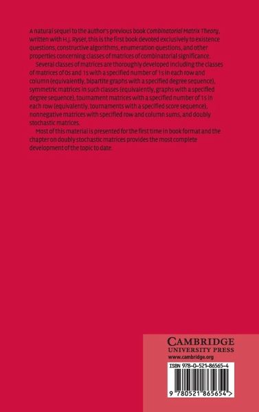 A natural sequel to the author's previous book Combinatorial Matrix Theory written with H. J. Ryser, this is the first book devoted exclusively to existence questions, constructive algorithms, enumeration questions, and other properties concerning classes of matrices of combinatorial significance. Several classes of matrices are thoroughly developed including the classes of matrices of 0's and 1's with a specified number of 1's in each row and column (equivalently, bipartite graphs with a specified degree sequence), symmetric matrices in such classes (equivalently, graphs with a specified degree sequence), tournament matrices with a specified number of 1's in each row (equivalently, tournaments with a specified score sequence), nonnegative matrices with specified row and column sums, and doubly stochastic matrices. Most of this material is presented for the first time in book format and the chapter on doubly stochastic matrices provides the most complete development of the topic to date.